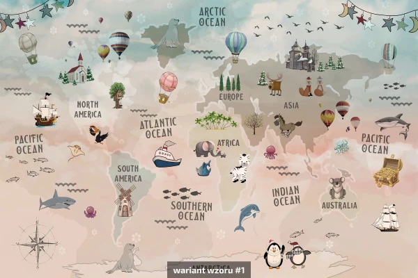 Ten wzór przedstawia stylizowaną mapę świata w odcieniach szarości, która emanuje elegancją i nostalgiczną nutą podróżniczej romantyki. Kontynenty i oceany oznaczone są klasyczną czcionką, przywodzącą na myśl stare kartograficzne księgi. Na tle puszystych, malarsko oddanych chmur wznoszą się ikony światowej architektury — dumny Big Ben z Londynu, majestatyczny Łuk Triumfalny z Paryża, pochylona Wieża w Pizie oraz charakterystyczna czerwona budka telefoniczna, symbol Wielkiej Brytanii. Nad mapą unoszą się delikatne balony, jakby zapraszające do marzycielskiej podróży dookoła świata. W dolnej części ilustracji, u podstawy kontynentów, rozciąga się pas lodowych gór i śnieżnych szczytów, dodając całości baśniowego klimatu. Tapeta mapa świata dla dzieci doskonale sprawdzi się jako dekoracja do pokoju dziecka, łącząc w sobie walory edukacyjne i estetyczne.