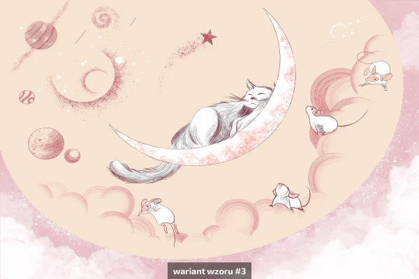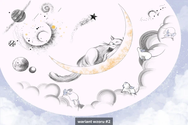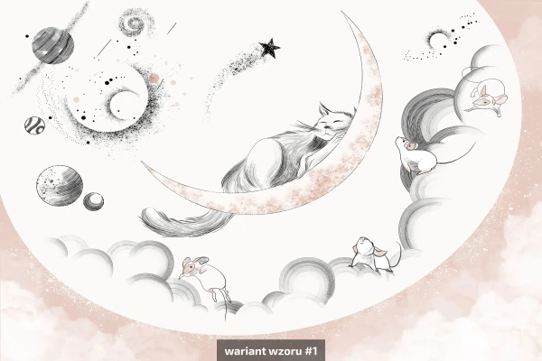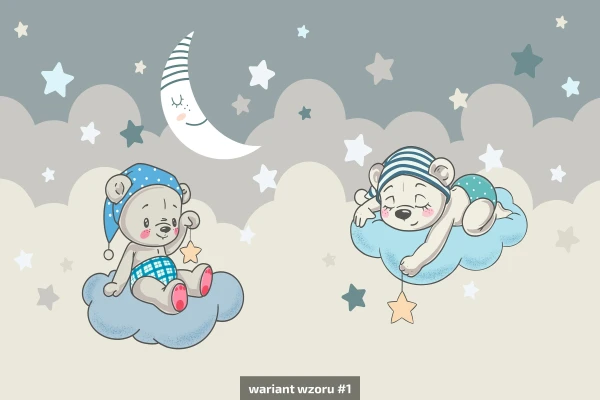 Wzór przedstawia uroczego króliczka śpiącego na srebrzystym księżycu, unoszącym się wśród delikatnych chmur i złotych gwiazd na tle w akwarelowych odcieniach szarości. Kompozycja emanuje spokojem i czułością, tworząc idealną atmosferę do snu i wypoczynku w dziecięcym pokoju. Tapeta do pokoju niemowlaka to bajkowy motyw, który doskonale sprawdzi się jako element dekoracyjny, wprowadzając poczucie bezpieczeństwa i magii do wnętrza malucha.